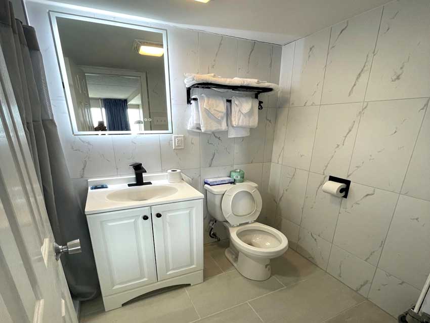 This spacious room with two queen beds is a great option for families or friends traveling together. While it faces the parking lot, it offers easy access to all the beachside fun just steps away. Enjoy the convenience of a full-size refrigerator and microwave—perfect for storing drinks, snacks, or quick meals. Comfortable, practical, and budget-friendly, this room has everything you need for a relaxing stay near the ocean.